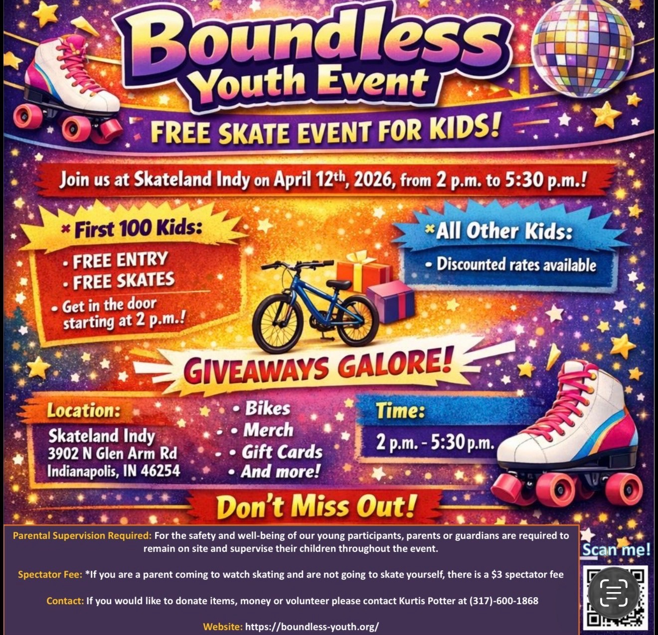 Join us for our upcoming “Boundless Youth Skating Event”, combining roller skating fun with giveaways and positive guidance from our staff and volunteers.